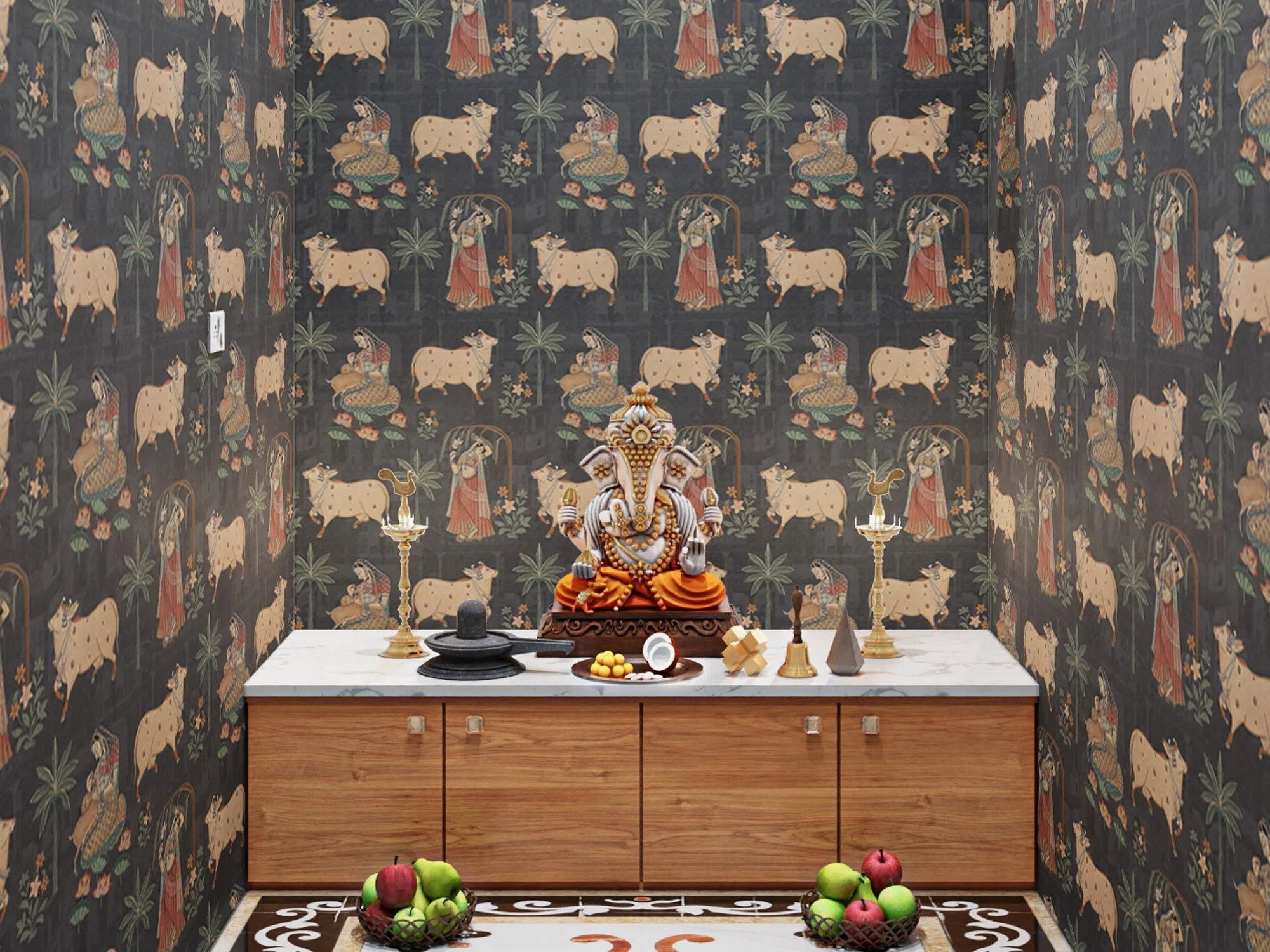 If you want the pooja room to feel truly traditional and premium, pichwai wallpaper is one of the most striking choices. Inspired by Nathdwara paintings, Pichwai art often features motifs like lotus ponds, cows, peacocks, temple elements, and devotional scenes.
