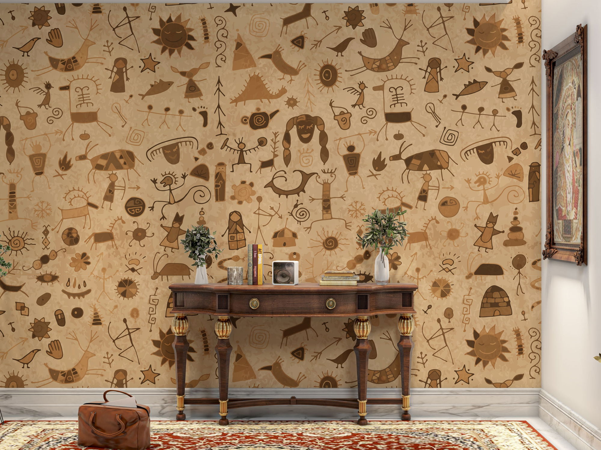 Warli art wallpaper represents one of India’s most iconic tribal art forms, characterized by simple yet expressive stick figures and geometric patterns. This style is perfect for adding an artistic, handcrafted feel to your walls without overwhelming the space. Because Warli art wallpaper uses minimal colors, often monochromatic white on earthy backgrounds, it works well in modern homes seeking a connection to traditional Indian aesthetics. It also offers a subtle warmth, making it ideal for bedrooms, dining areas, or hallways where you want to evoke a sense of calm and groundedness.